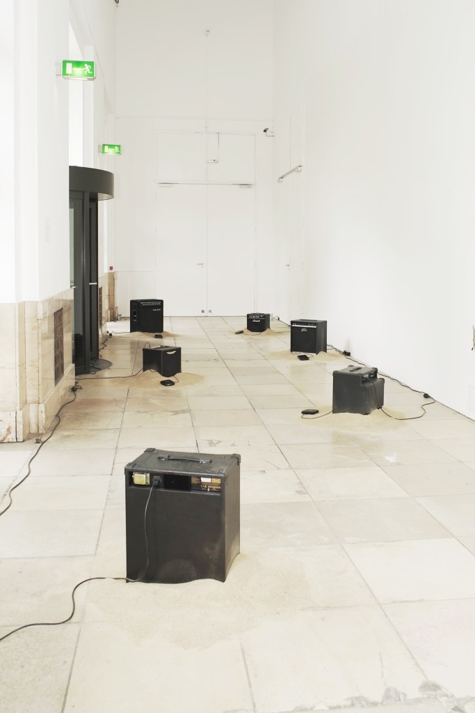 Six bass guitar amps grow like black mesas out of the sand and the marble floor of the Haus der Kunst. Each amp very in brand, size and modification and is connected to a black Sony Discman from the 1990s. The inserted CDs contain one track of a six voices ambient composition. You can hear a distorted Roland 808-bass-drum, drone sounds which are generated with the 1982 Roland Juno 60, a damped sounding piano, field recordings and Joan Lorrings voice repeating the sentence “Here in the desert it’s just the same thing over and over again”. An endless composition arises while playing the CDs simultaneously and connecting the voices in different ways. The piece continuously generates itself and assembles the voices within the room as a performance without (human) performer.