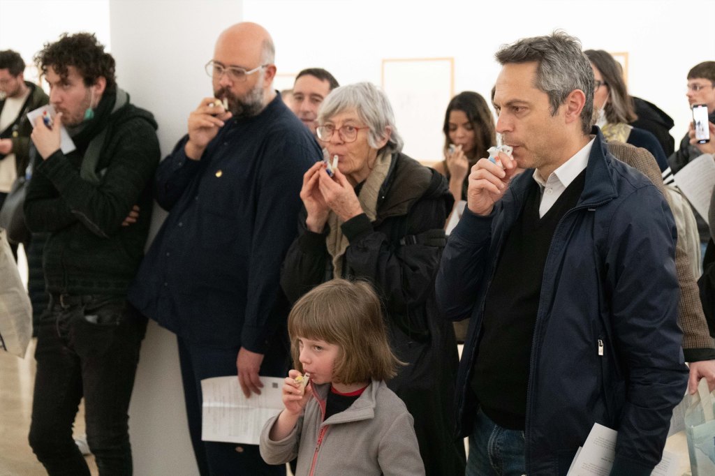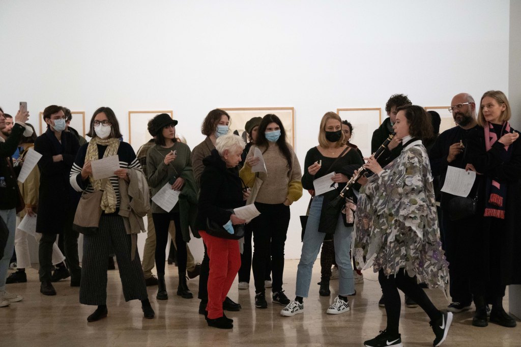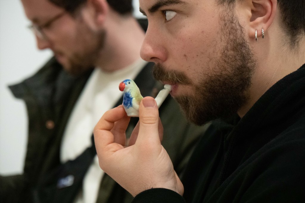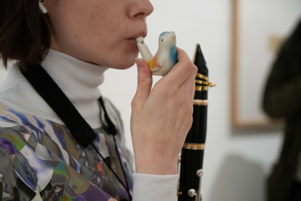 All visitors received a ceramic bird whistle filled with water as well as an instruction manual. The manual encourages sound interaction – both with the other visitors and with a clarinettist performing a choreography through the exhibition. Between the individual movements, space is created for interaction and performative gestures: A chorus of bird whistles rises up and creates the image of a dissonantly vibrating forest.