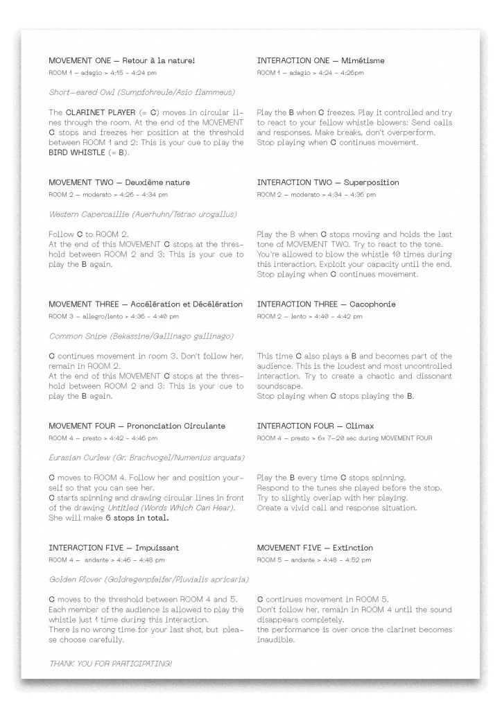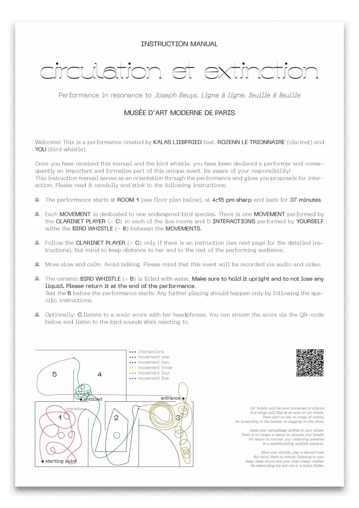 Circulation et Extinction was staged as an interactive sound performance for solo clarinet and bird whistle in resonance to the exhibition Joseph Beuys. Ligne à ligne, feuille à feuille at Musée d’Art Moderne de Paris. The performance deals with the extinction of endangered bird species and the silencing of numerous natural habitats as an expected result of this ecological disaster. A field of tension is created between the circulation and extinction of sounds, in which each individual can see itself as a dynamic unit.