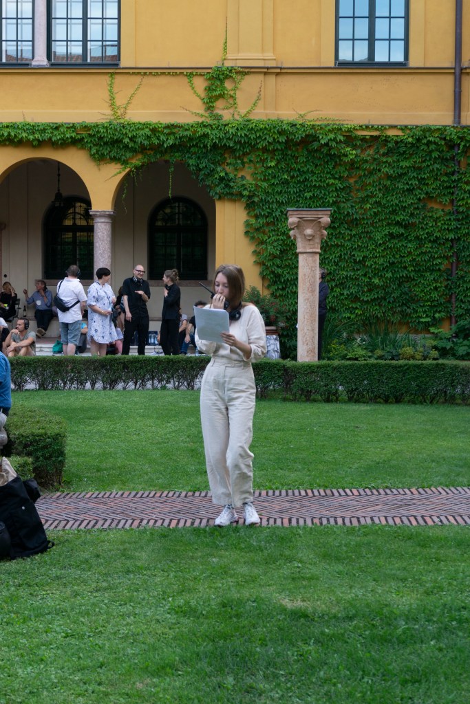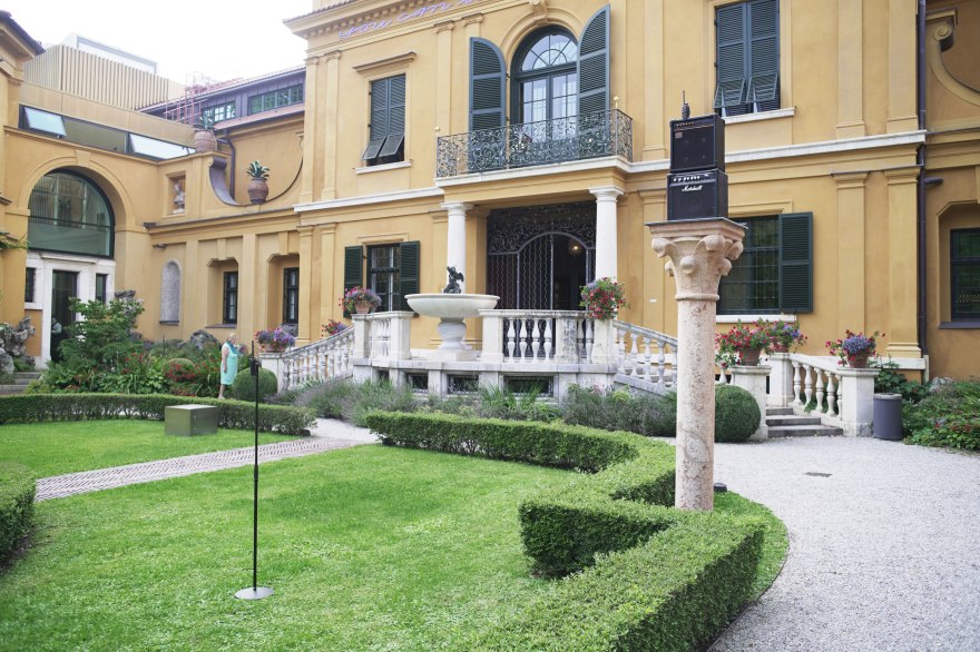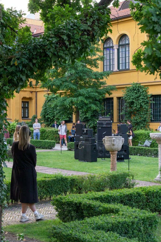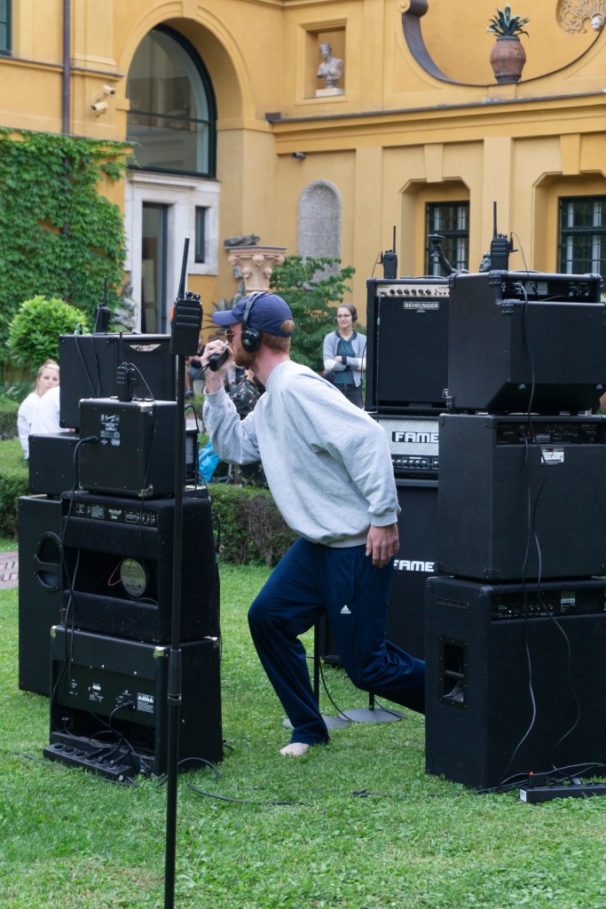 Within the sequences in which the sound fades into the background, a space opens up for the participation: In a performative live version of the sound piece, the Lenbachhaus‘s garden is defined as an open field of sending and receiving. Members of the audience can become involved as accomplices of the performance: equipped with instruction manuals and walkie-talkies, they can send signals to a monumental guitar amplifier sculpture and become a formative part of the performance.