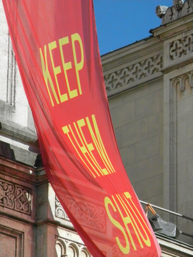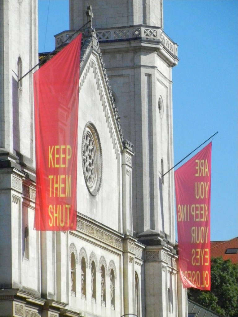 The two flags are placed at the towers of the Ludwigskirche next to Munichs Ludwig Maximilians Univerity and the Ludwigstraße – one of the most frequented streets in the city. Through their signal effect and their monumentality, the flags are very attractive to look at. At the second sight the text placed on the flags asks “Are you keeping your eyes closed?” with the first flag and answers “Keep them shut” with the second. It is a mismatch of form and content. This work is a reference to the state between sleep and waking, the state of coincident consciousness and unconscious as a structure of constituting reality.